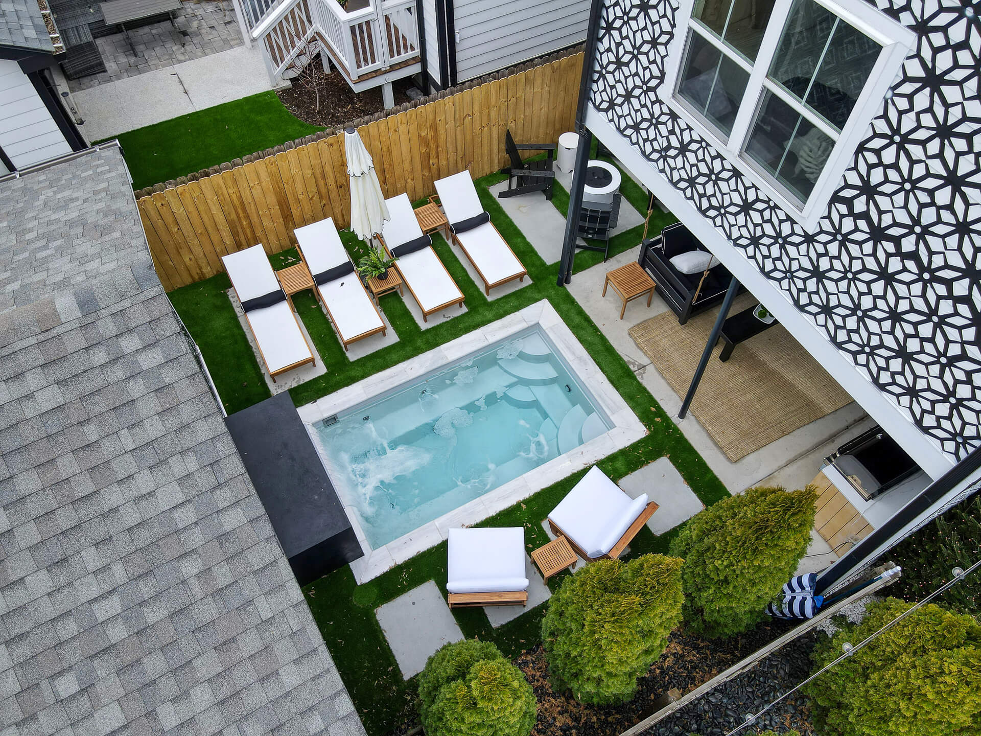 A complete backyard transformation experience. New hardscape, pool house and a fantastic new dip pool.